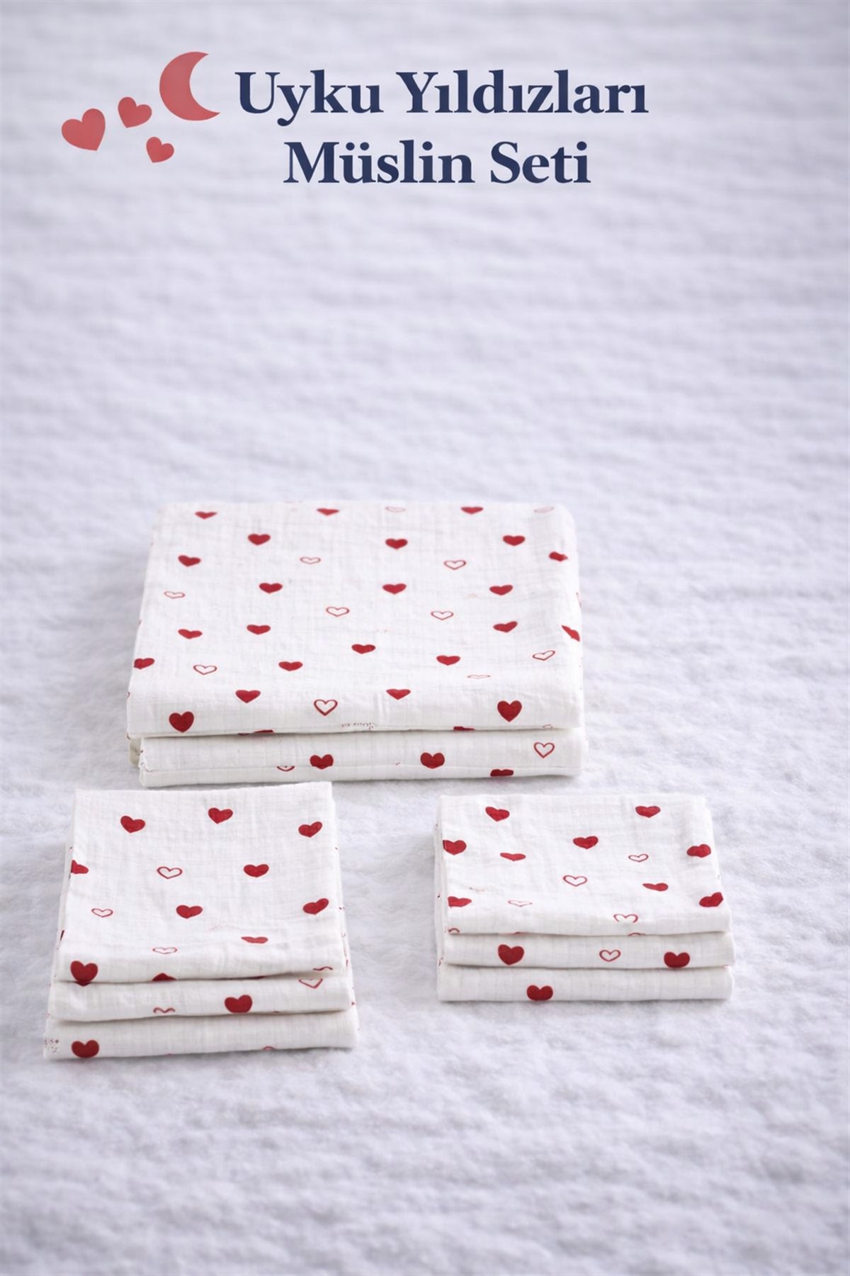 More Home % 100 Pamuk Müslin Örtü, Bebek Battaniyesi 6 Parça Set Kalp Desenli Beyaz Kırmızı