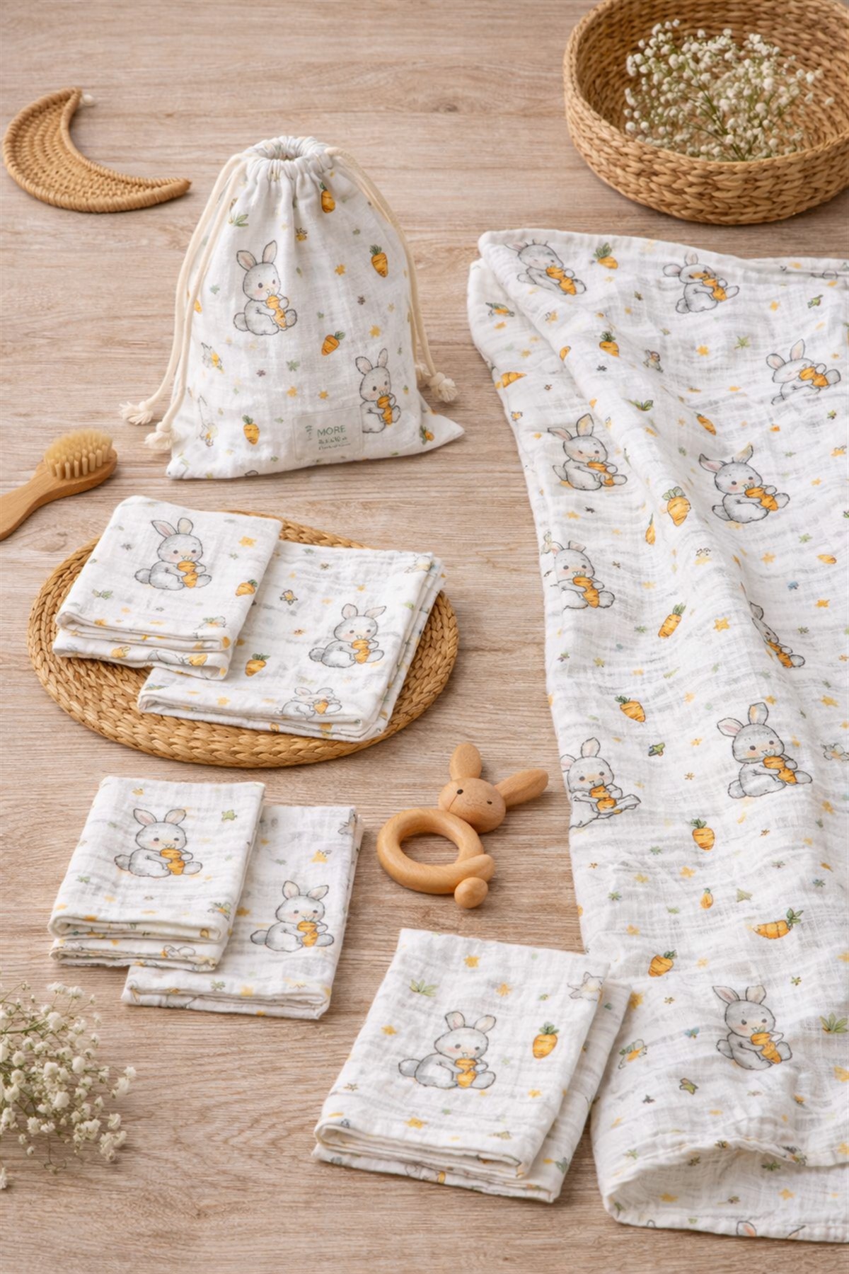 More Home Çok Amaçlı Müslin Bez Battaniye Set 5 Parça Havuç Yiyen Tavşan