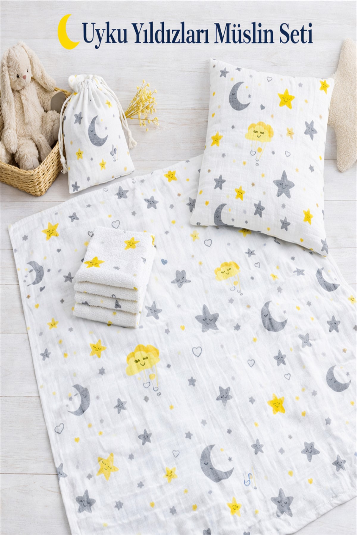 29 Ocak 2025More Home % 100 Pamuk Müslin Örtü, Bebek Battaniyesi 7 Parça Set Ay Yıldızlı Gri Sarı