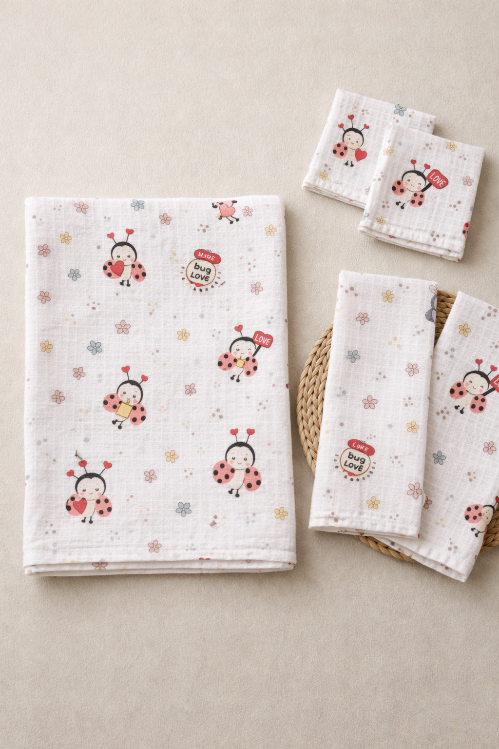 9 Mart 2026More Home % 100 Pamuk Müslin Örtü, Bebek Battaniyesi 5 Parça Set Uğur Böceği Beyaz Kırmızı