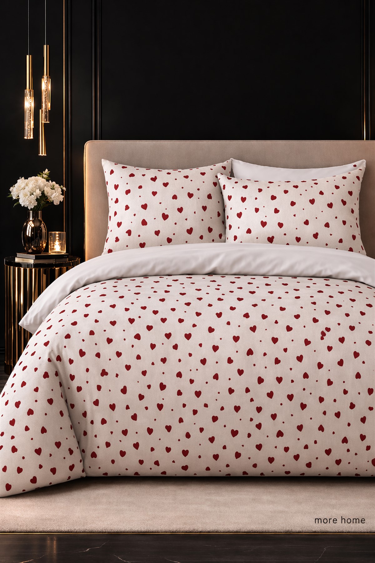 More Home Çift Kişilik Lastikli Çarşaf Nevresim Takımı Beyaz Kırmızı Kalp Desenli