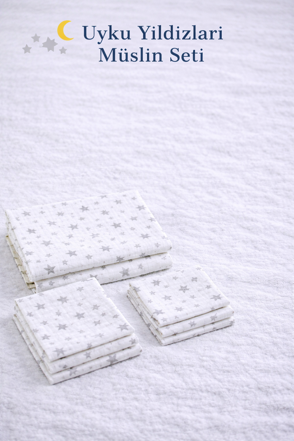 More Home % 100 Pamuk Müslin Örtü, Bebek Battaniyesi 6 Parça Set Yıldızlı Gri Beyaz